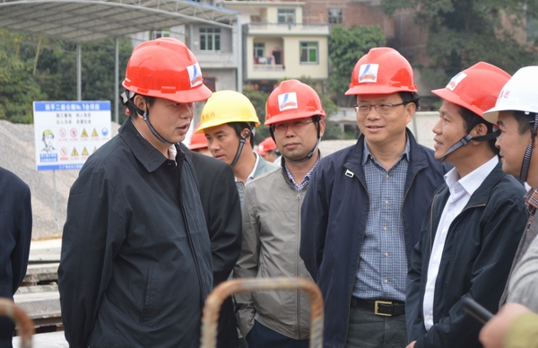 自治區交通運輸廳廳長潘?。ㄗ笠唬┰谀瞧铰讽椖渴┕がF場認真聽取集團公司董事長朱堅和(右二)工作匯報
