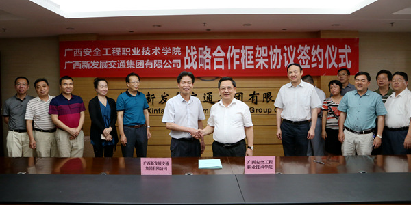 黎志逘祝賀雙方正式建立戰(zhàn)略合作伙伴關(guān)系。他說,廣西安全工程職業(yè)技術(shù)學(xué)院是經(jīng)廣西壯族自治區(qū)人民政府批準(zhǔn)成立、教育部備案的公辦全日制普通高等職業(yè)學(xué)院,隸屬廣西壯族自治區(qū)安全生產(chǎn)監(jiān)督管理局管理,是廣西唯一一所、全國第三所專門培養(yǎng)安全類高等專業(yè)技術(shù)人才的現(xiàn)代化職業(yè)學(xué)院。為了深入貫徹黨的十八屆六中全會和習(xí)近平總書記、李克強總理關(guān)于安全生產(chǎn)工作的重要指示批示精神,推動企業(yè)落實安全生產(chǎn)主體責(zé)任,在全社會凝聚弘揚安全發(fā)展理念、支持安全生產(chǎn)的共識,“十三五”期間乃至更長一個時期,雙方將建立互信、互補、互援的戰(zhàn)略合作關(guān)系,開啟校企全面深入合作的新篇章。通過深入合作交流,促進了廣西安全工程職業(yè)技術(shù)學(xué)院發(fā)展,提升了廣西新發(fā)展交通集團有限公司在安全生產(chǎn)方面的實力,最終實現(xiàn)雙方的共贏。