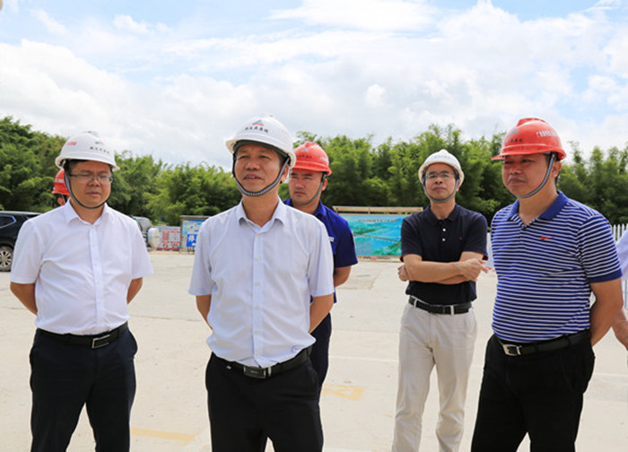 圖為朱堅(jiān)和董事長(左二)在桂江大橋施工現(xiàn)場(chǎng)調(diào)研